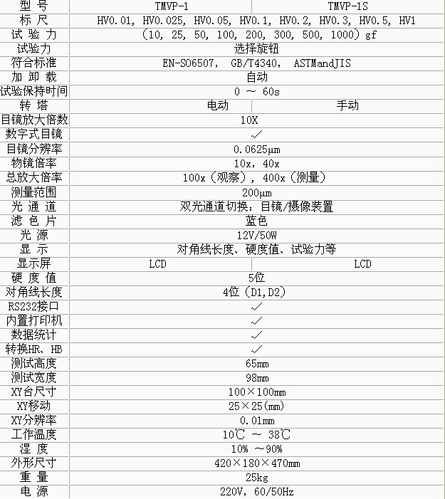 產(chǎn)品概述: • TMVP-1/TMVP-1S大屏數(shù)顯自動(dòng)(手動(dòng))轉(zhuǎn)塔顯微維氏硬度計(jì)該機(jī)采用計(jì)算機(jī)軟件編程,高倍率光學(xué)測(cè)量系統(tǒng),,光電傳感等技術(shù),通過(guò)軟鍵輸入,能調(diào)節(jié)測(cè)量光源的強(qiáng)弱等。 • 適用于測(cè)量微小、薄形試件、表面滲鍍處理后的零件和對(duì)瑪瑙、玻璃、陶瓷等脆性材料的顯微和努氏硬度的測(cè)定 以及涂層、表面覆層、層壓金屬、熱處理碳化層和淬火硬化層的深度與硬度梯度的測(cè)定。是科研機(jī)構(gòu)、工廠及質(zhì)檢部門進(jìn)行研究和檢測(cè)的理想的硬度測(cè)試儀器。 功能特點(diǎn): • 操作面板的LCD屏幕上能預(yù)置試驗(yàn)力保持時(shí)間、選擇維氏和努氏試驗(yàn)方法、對(duì)照表、文件號(hào)與儲(chǔ)存等• 通過(guò)軟件輸入,光源的強(qiáng)弱自動(dòng)調(diào)節(jié),并選擇維氏和努氏試驗(yàn)方法、保持時(shí)間、文件號(hào)、儲(chǔ)存等。 • 顯示測(cè)量壓痕長(zhǎng)度、硬度值、試驗(yàn)力保持時(shí)間,,轉(zhuǎn)換值、測(cè)量次數(shù)和年、月、日及時(shí)間等。 • 試驗(yàn)結(jié)果和數(shù)據(jù)處理,,并通過(guò)打印機(jī)輸出,還能通過(guò)RS232接口與計(jì)算機(jī)連網(wǎng)。 • 硬度計(jì)還可根據(jù)用戶特殊需求配置CCD圖像自動(dòng)測(cè)量裝置、視頻裝置和攝像裝置。能對(duì)所測(cè)壓痕和材料金相組織進(jìn)行拍攝。 技術(shù)參數(shù):