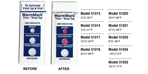 溫度指標(biāo)標(biāo)簽是體積小、成本低的溫度指示標(biāo)簽或時(shí)間/溫度標(biāo)簽,使用于食品運(yùn)輸、儲(chǔ)存或處理過(guò)程。典型的用途包括監(jiān)測(cè)藥品、化學(xué)品和新鮮農(nóng)產(chǎn)品在運(yùn)輸過(guò)程中德溫度。如果溫度超出預(yù)設(shè)的限制之外,標(biāo)簽顯示變色。 DeltaTrak提供滿足你各種需要的標(biāo)簽:WarmMark溫度標(biāo)簽、高溫?zé)針?biāo)簽和TempDot時(shí)間溫度指示標(biāo)簽顯示溫度變 化超過(guò)預(yù)設(shè)的時(shí)間。FreezeCheck和ColdMark溫度標(biāo)簽用于顯示運(yùn)輸溫度低于0℃。商業(yè)洗碗機(jī)使用的TempDot高溫?zé)針?biāo)簽可顯示最終沖 洗水溫是否達(dá)到71℃(HACCP體系所要求的溫度)。 WarmMark 溫度標(biāo)簽,型號(hào)51013-51035,, 監(jiān)控產(chǎn)品在運(yùn)輸、 儲(chǔ)存或處理過(guò)程中的溫度。反應(yīng)溫度范圍可從-18℃至37℃。這些不干膠標(biāo)簽直接適用于產(chǎn)品、包裝、紙箱或大包裝上。一旦反應(yīng)溫度達(dá)到或超過(guò),標(biāo)簽便被激 活而發(fā)生不可逆變色。紅色顯示溫度的閾值外暴露經(jīng)過(guò)了一個(gè)短暫,中等或長(zhǎng)久的時(shí)間段。你一眼便能看出是否有溫度閾值外暴露發(fā)生,,提供質(zhì)量保證的永久記錄。