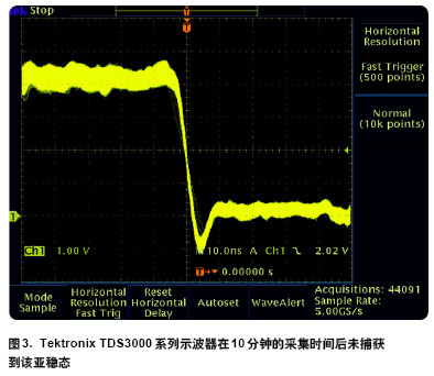 圖3 是嘗試用Tektronix TDS3000 系列示波器捕獲同樣的異常事件該示波器采用默認的實時采集模式具有10 k 點的最大存儲器。由于在此特定條件下的示波器更新不到每秒 800 次把探頭放在測試點上 10 秒后我們未捕獲到任何異常。在這一更新率下一般需要在該測試點上探測 1 分鐘才能捕獲到每 50,000個周期平均僅產(chǎn)生一次的一個偶發(fā)毛刺。
