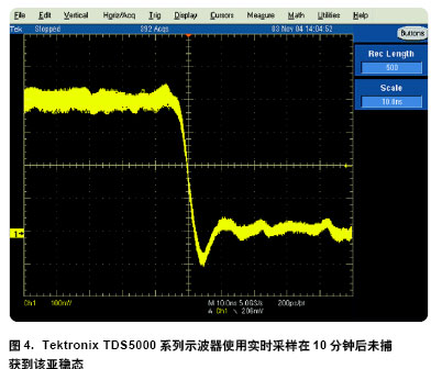 圖 4 是使用 Tektronix 高性能TDS5000 系列示波器的類似例子它有100,000 波形/ 秒的標志性波形3用實時采樣捕獲亞穩(wěn)態(tài)(續(xù))更新率指標。但由于其默認的實時采集更新率被限制為只有60 波形/秒因此捕獲到該異常仍僅有很低的概率。雖然60 波形/ 秒對于示波器的“實況”感覺是足夠快的但為捕獲到僅僅一個毛刺需要把探頭放在測試點上的平均時間將近 14 分鐘。