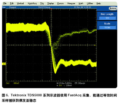 在使用四種不同示波器實時采集模式的上述例子中只有采用MegaZoom技術的 Agilent MSO6000系列示波器能可靠捕獲偶發(fā)的亞穩(wěn)態(tài)(圖1)。但使用其它“專門”采集模式時情況又會如何呢?如前所述Tektronix TDS5000 系列示波器宣稱具有高于100,000 波形/ 秒的標志性波形更新率指標。該更新率對捕獲偶發(fā)事件(50,000 周期中的1個)應是足夠的。使用Tektronix 的FastAcq采集模式TDS5000系列示波器確能以超過100,000/ 秒的采集捕獲波形如圖6所示。但為使用這一工作模式您必須作出多方面的權衡。該FastAcq 模式: