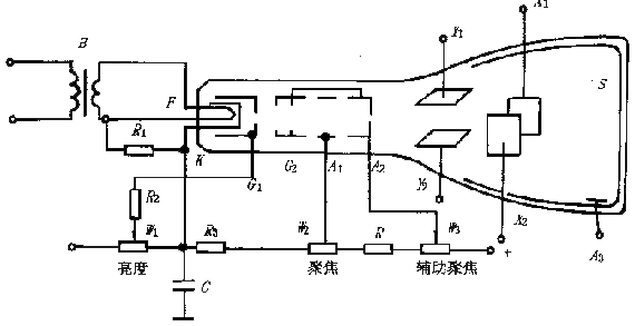 電子槍由燈絲(F)、陰極(K)、柵極(G1)、前加速極(G2)(或稱第二柵極)、第一陽極(A1)和第二陽極(A2)組成。它的作用是發(fā)射電子并形成很細(xì)的高速電子束。燈絲通電加熱陰極陰極受熱發(fā)射電子。柵極是一個頂部有小孔的金屬園筒套在陰極外面。由于柵極電位比陰極低對陰極發(fā)射的電子起控制作用一般只有運動初速度大的少量電子在陽極電壓的作用下能穿過柵極小孔奔向熒光屏。初速度小的電子仍返回陰極。如果柵極電位過低則全部電子返回陰極即管子截止。調(diào)節(jié)電路中的W1電位器可以改變柵極電位控制射向熒光屏的電子流密度從而達(dá)到調(diào)節(jié)亮點的輝度。第一陽極、第二陽極和前加速極都是與陰極在同一條軸線上的三個金屬圓筒。前加速極G2與A2相連所加電位比A1高。G2的正電位對陰極電子奔向熒光屏起加速作用。