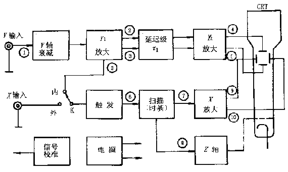 被測信號①接到“Y"輸入端經(jīng)Y軸衰減器適當(dāng)衰減后送至Y1放大器(前置放大)推挽輸出信號②和③。經(jīng)延遲級延遲Г1時間到Y(jié)2放大器。放大后產(chǎn)生足夠大的信號④和⑤加到示波管的Y軸偏轉(zhuǎn)板上。為了在屏幕上顯示出完整的穩(wěn)定波形將Y軸的被測信號③引入X軸系統(tǒng)的觸發(fā)電路在引入信號的正(或者負(fù))極性的某一電平值產(chǎn)生觸發(fā)脈沖⑥啟動鋸齒波掃描電路(時基發(fā)生器)產(chǎn)生掃描電壓⑦。由于從觸發(fā)到啟動掃描有一時間延遲Г2為保證Y軸信號到達(dá)熒光屏之前X軸開始掃描Y軸的延遲時間Г1應(yīng)稍大于X軸的延遲時間Г2。掃描電壓⑦經(jīng)X軸放大器放大產(chǎn)生推挽輸出⑨和⑩加到示波管的X軸偏轉(zhuǎn)板上。z軸系統(tǒng)用于放大掃描電壓正程并且變成正向矩形波送到示波管柵極。這使得在掃描正程顯示的波形有某一固定輝度而在掃描回程進(jìn)行抹跡。