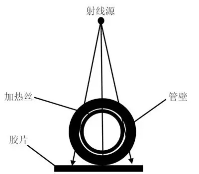 空速管透照示意如圖3所示其中外環(huán)為管壁內(nèi)部圓形線圈及加熱絲加熱絲通過焊料與管壁焊接在一起。因此如果用X射線照相檢測方法檢查空速管焊接情況那么只有射線與管體內(nèi)壁圓周相切的地方才能被準(zhǔn)確地發(fā)現(xiàn)缺陷。在管體其它部分也會有黑度的起伏變化但是由于內(nèi)部表面焊料的分布不均勻性和各種粗糙缺陷都會使底片黑度發(fā)生起伏變化無法判斷是否是加熱器與管壁焊接缺陷。