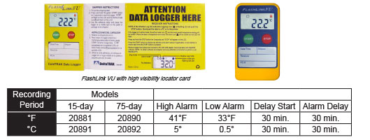 FlashLink VU 果蔬記錄儀 是專門設(shè)計(jì)用來(lái)記錄農(nóng)產(chǎn)品的貯存和運(yùn)輸溫度。記錄儀具有高/低報(bào)警設(shè)置預(yù)編程(41°F/33°F)。客戶運(yùn)輸農(nóng)產(chǎn)品可以使用這款一次性數(shù)據(jù)記錄儀。 它有一個(gè)大而易閱讀的液晶顯示屏,噴墨式溫度記錄儀,能夠提供即時(shí)的溫度信息和統(tǒng)計(jì)數(shù)據(jù),溫度記錄儀國(guó)儀棒圖,包括行程中的溫度上下極限、溫度超標(biāo)的累積時(shí)間、最高溫度、最低溫度和平均溫度。即 使是使用者不啟動(dòng)數(shù)據(jù)記錄儀,數(shù)字溫度記錄儀,其專利的影子記錄功能也能保證歷史溫度數(shù)據(jù)的獲取。 應(yīng)用:記錄溫度敏感的產(chǎn)品儲(chǔ)存和運(yùn)輸條件的理想設(shè)備。