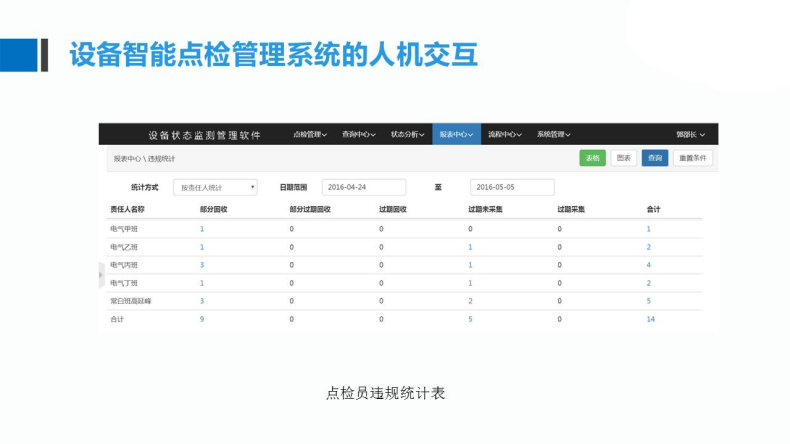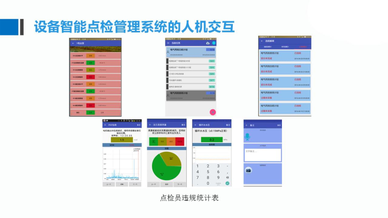 計(jì)劃點(diǎn)檢、臨時(shí)點(diǎn)檢、違規(guī)解釋、違規(guī)統(tǒng)計(jì)、生成計(jì)劃、狀態(tài)統(tǒng)計(jì)、任務(wù)交接